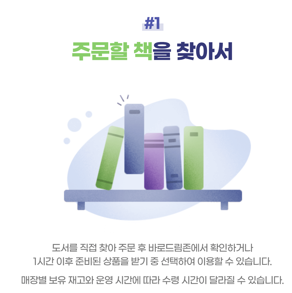 도서를 구입할 때 가장 구입하기 편리한 곳을 찾자면 교보문고 인 듯하다. 온라인 서점을 통해 구입해도 되지만 오프라인 매장을 방문해 직접 확인하고 구매할 수 있는 바로드림을 추천한다. 10%할인도 되니 도서를 구입하는 좋은 방법인 것 같다. 간혹 주차비가 발생할 수 있으나 카운터에 도서수령시 얘기하면 주차권을 주기도 하니 부담없이 사용해 보자.