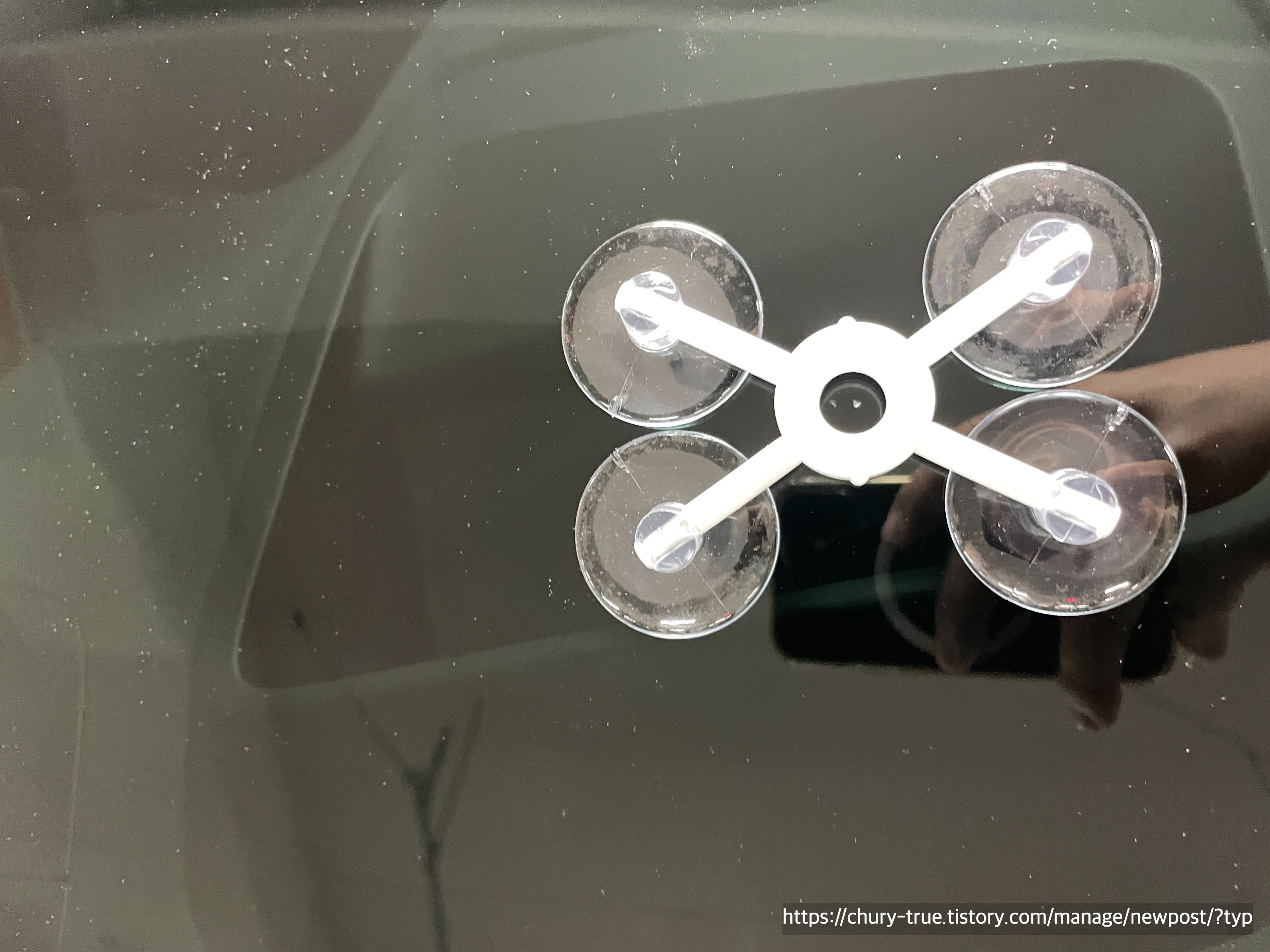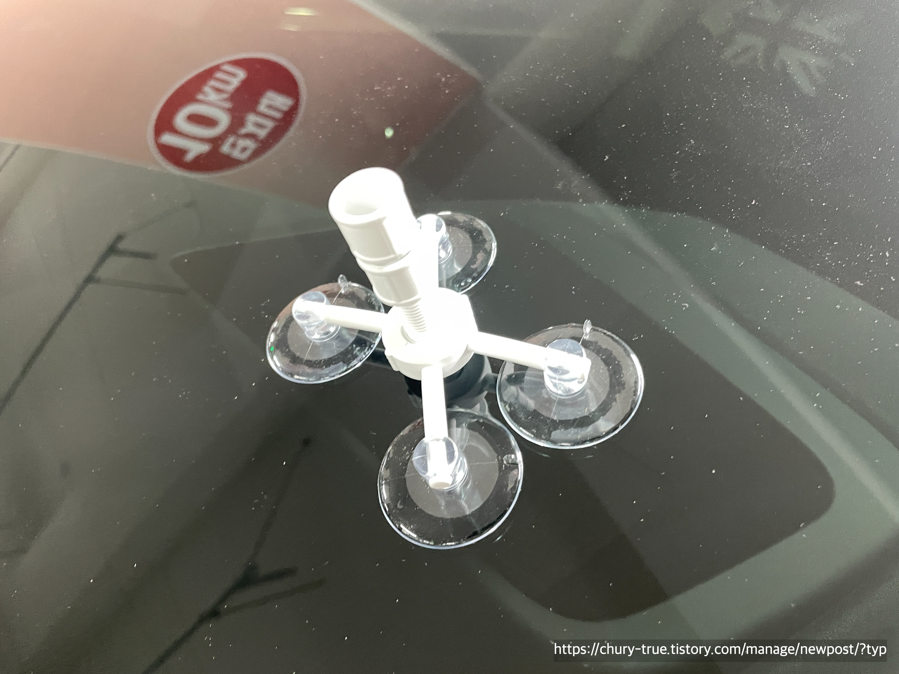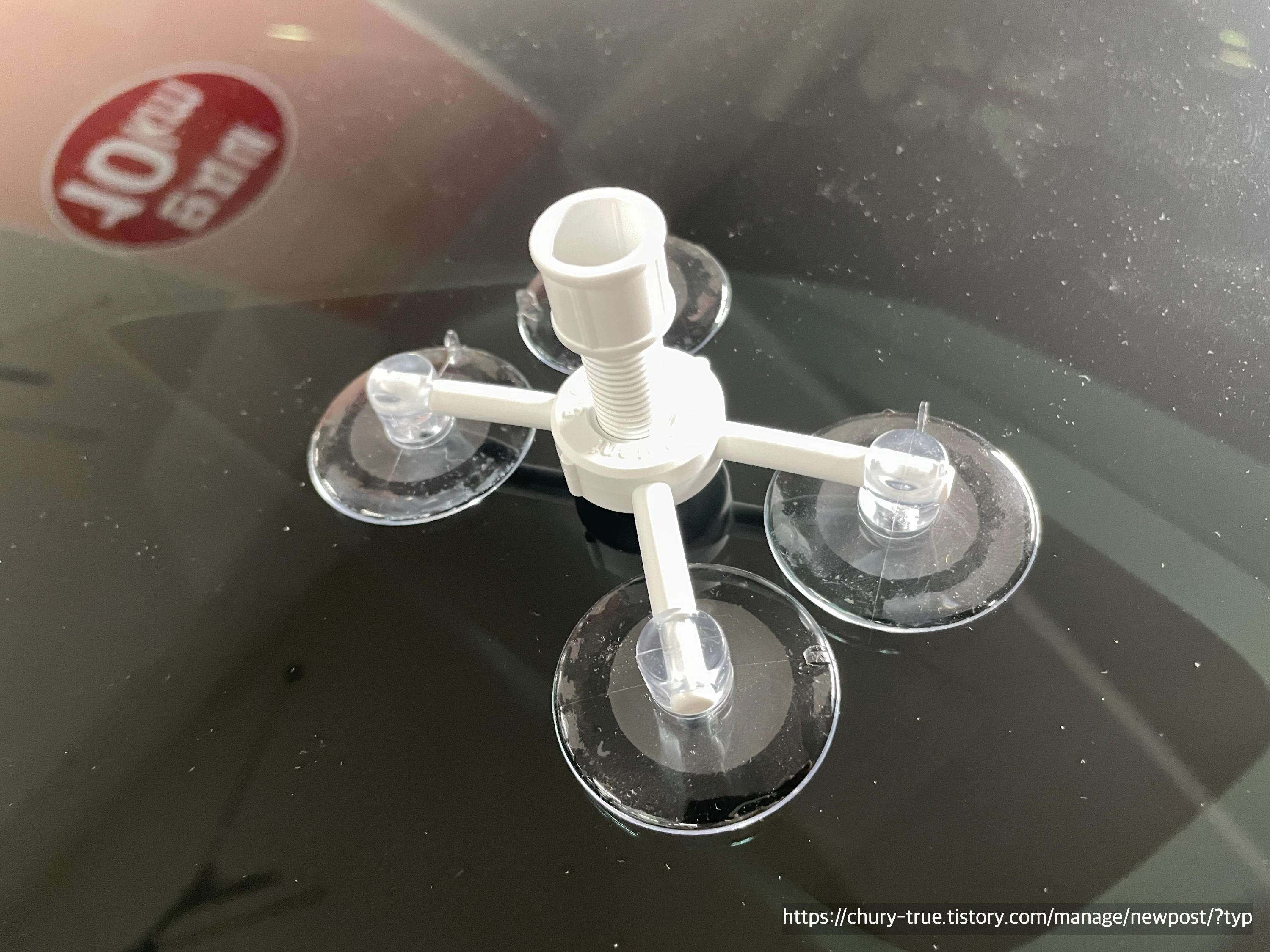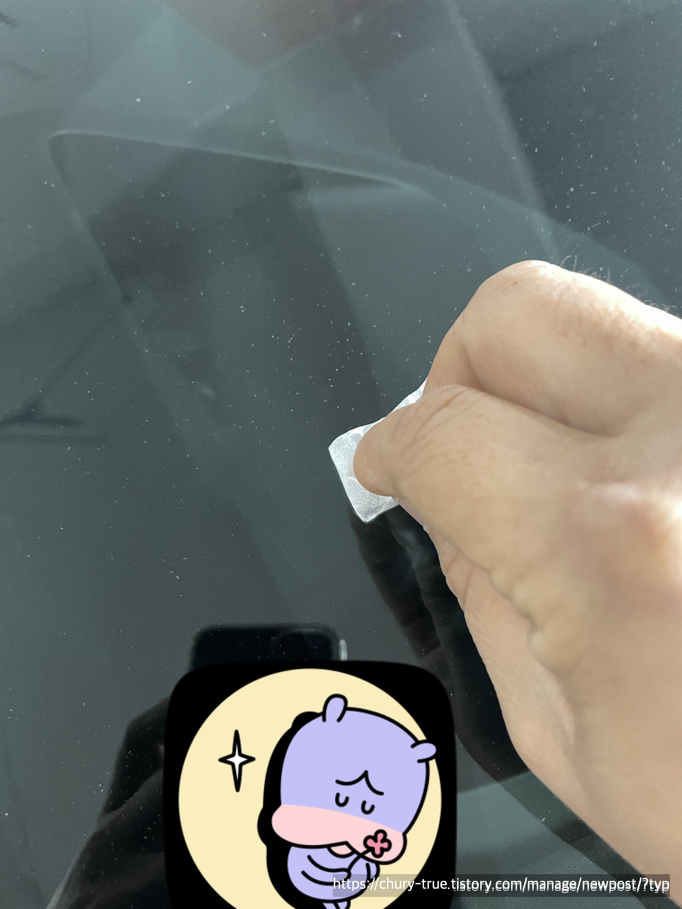 동봉되어 있는 키트를 유리에 설치한다. 파손된 부위가 중앙에 올 수 있게 설치하는 것이 아주 중요하다.