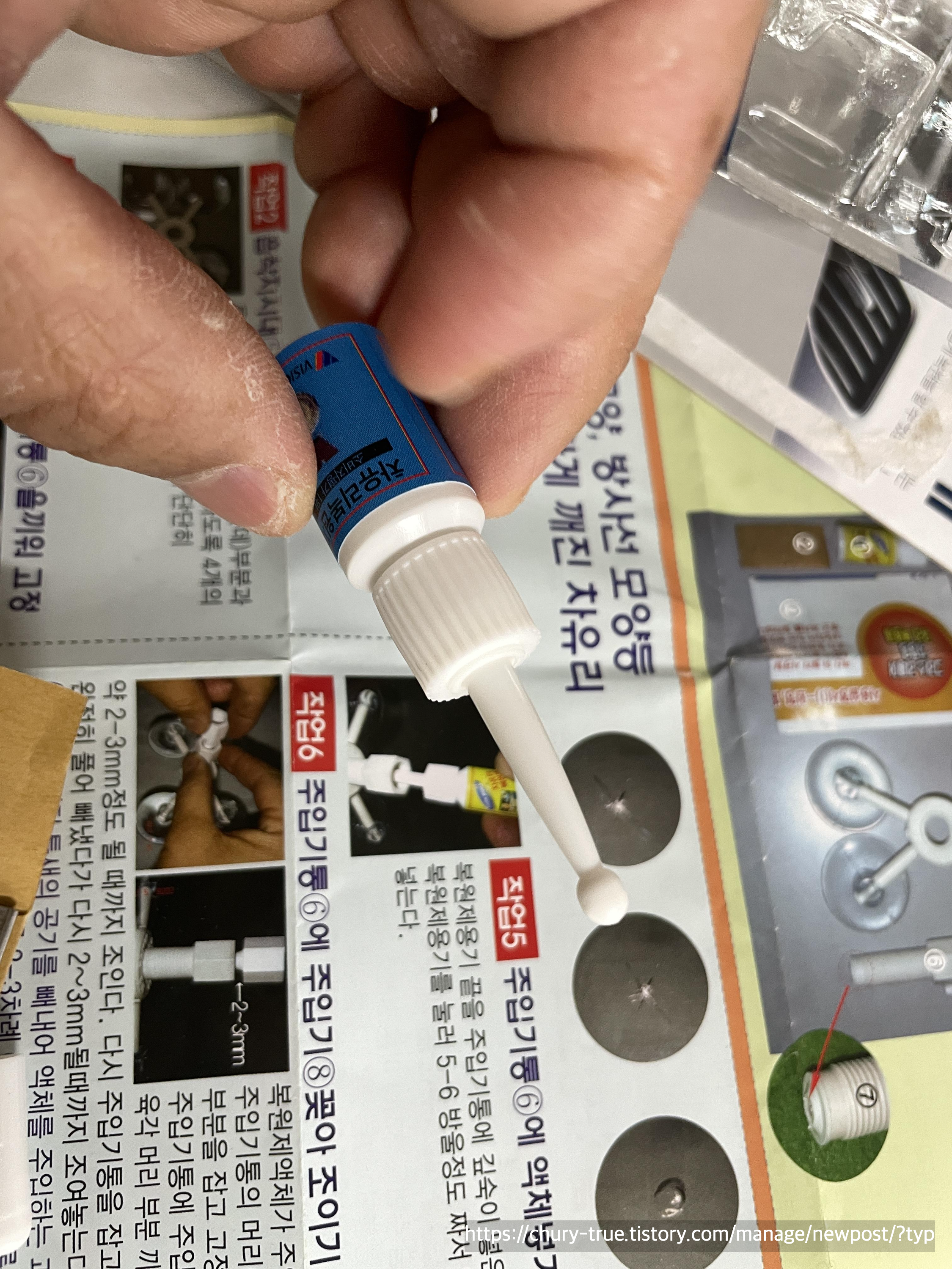 복원키트 설치 -> 센터 약액주입 플라스틱 설치(유리에만 밀착되게) -> 유리복원제 주입 -> 주입기 꽂아 약액 침투시키기