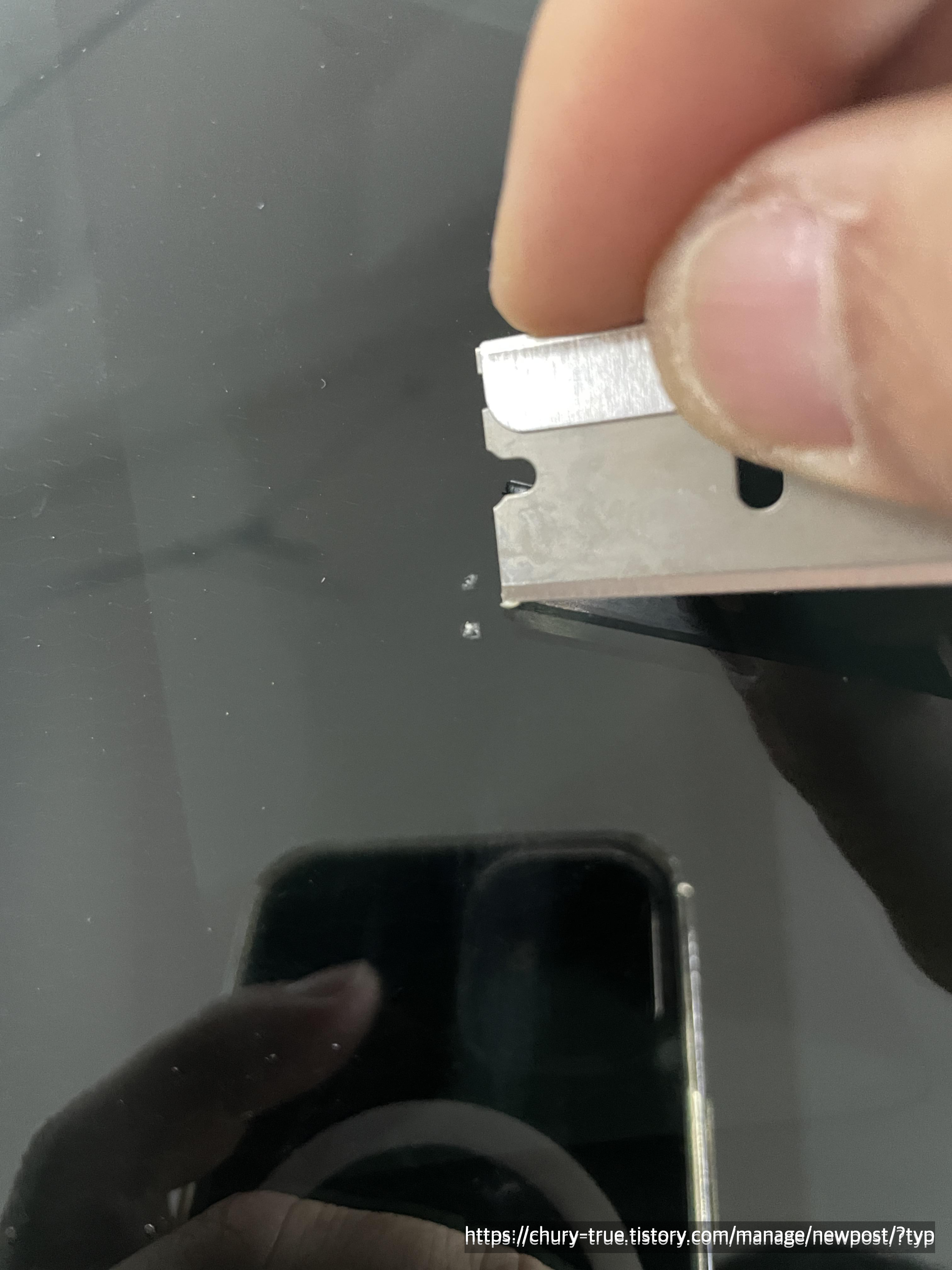 유리 파편을 정리하기 위해 동봉되어 있는 면도칼로 부스러기들을 제거해 주고 깨끗이 닦아준다.