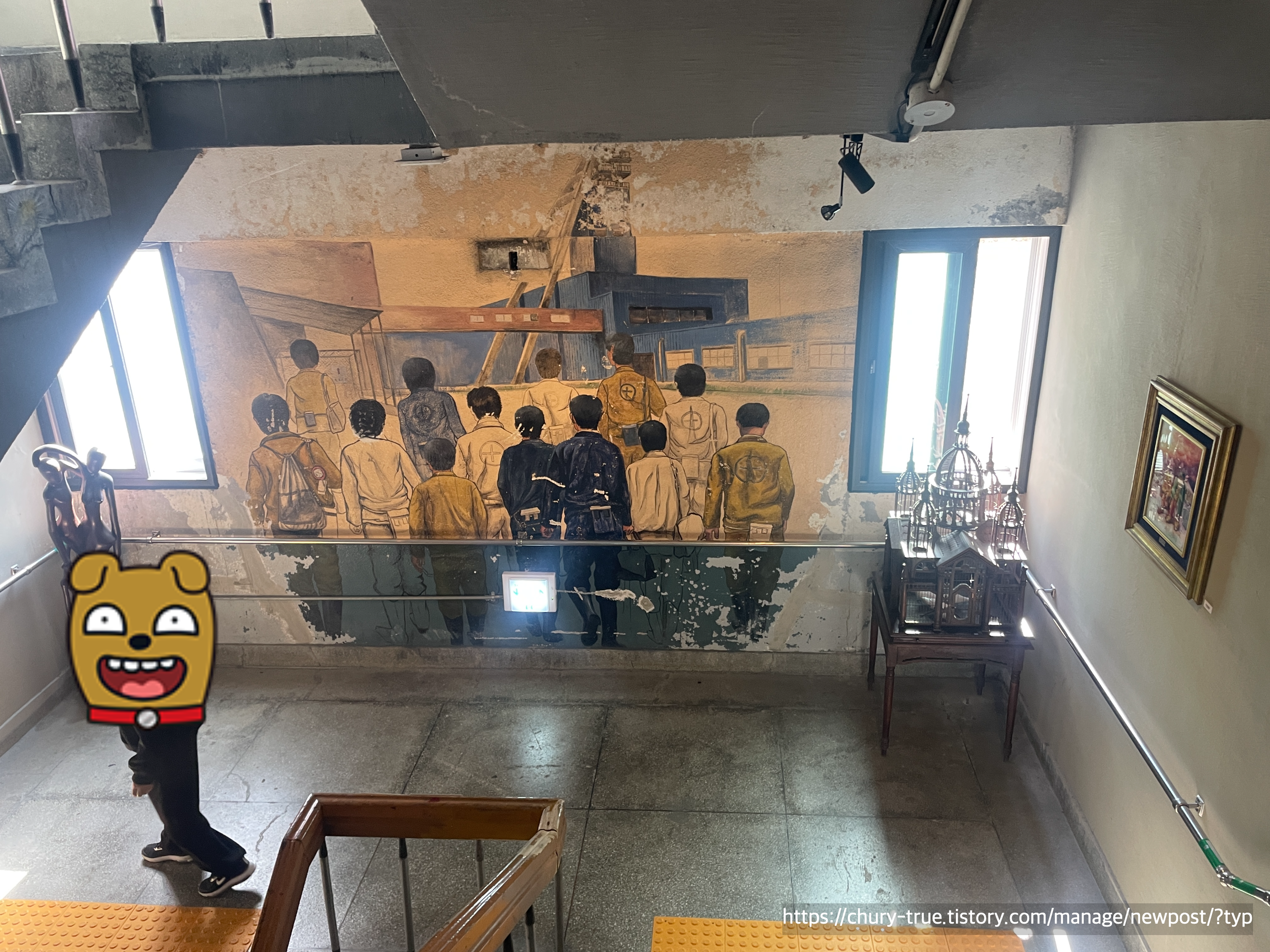아래층으로 내려가는 계단 곳곳에 벽화를 그려 놓았는데 탄광으로 운영되었던 생활을 그려놓은 듯 하다.