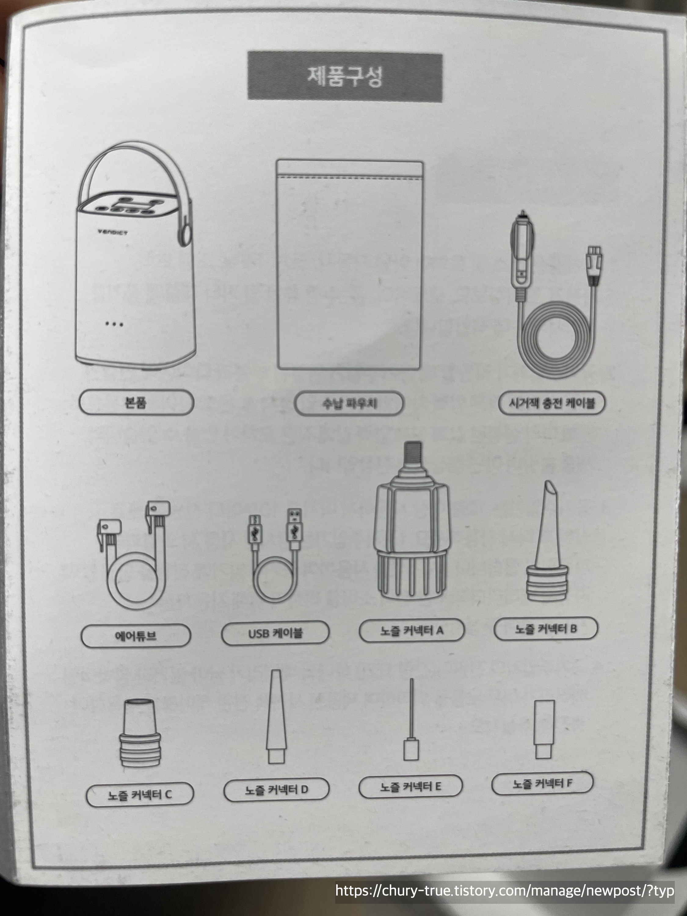 본품, 수납파우치, 시거잭 충전 케이블, 에어튜브, USB케이블, 노즐커넥터 6종으로 구성되어 있다.