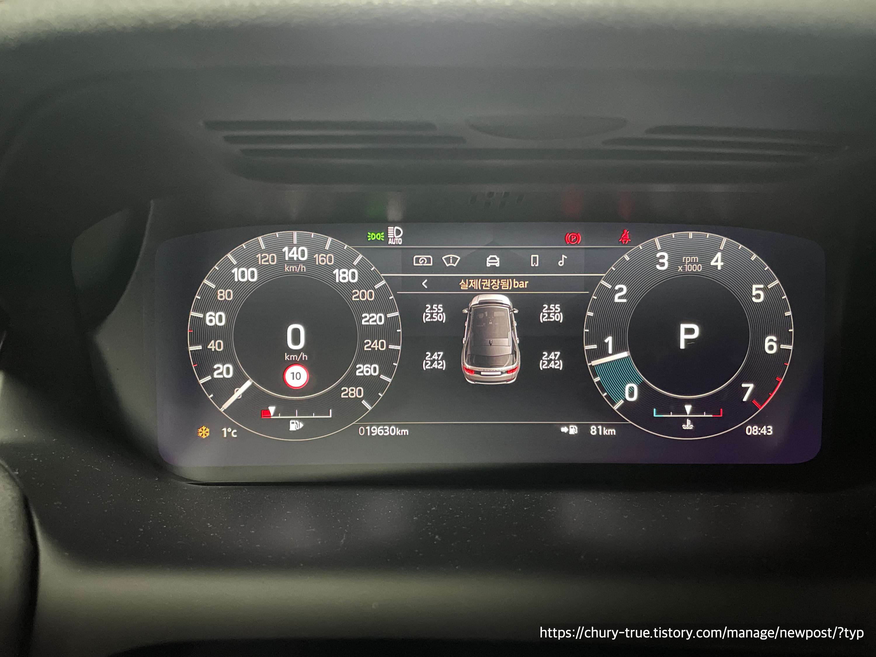 실제 권장수치와 0.05 BAR 더 충전된 것을 확인했다. 경고등은 사라졌고 적정한 타이어 공기압이 유지되었다.