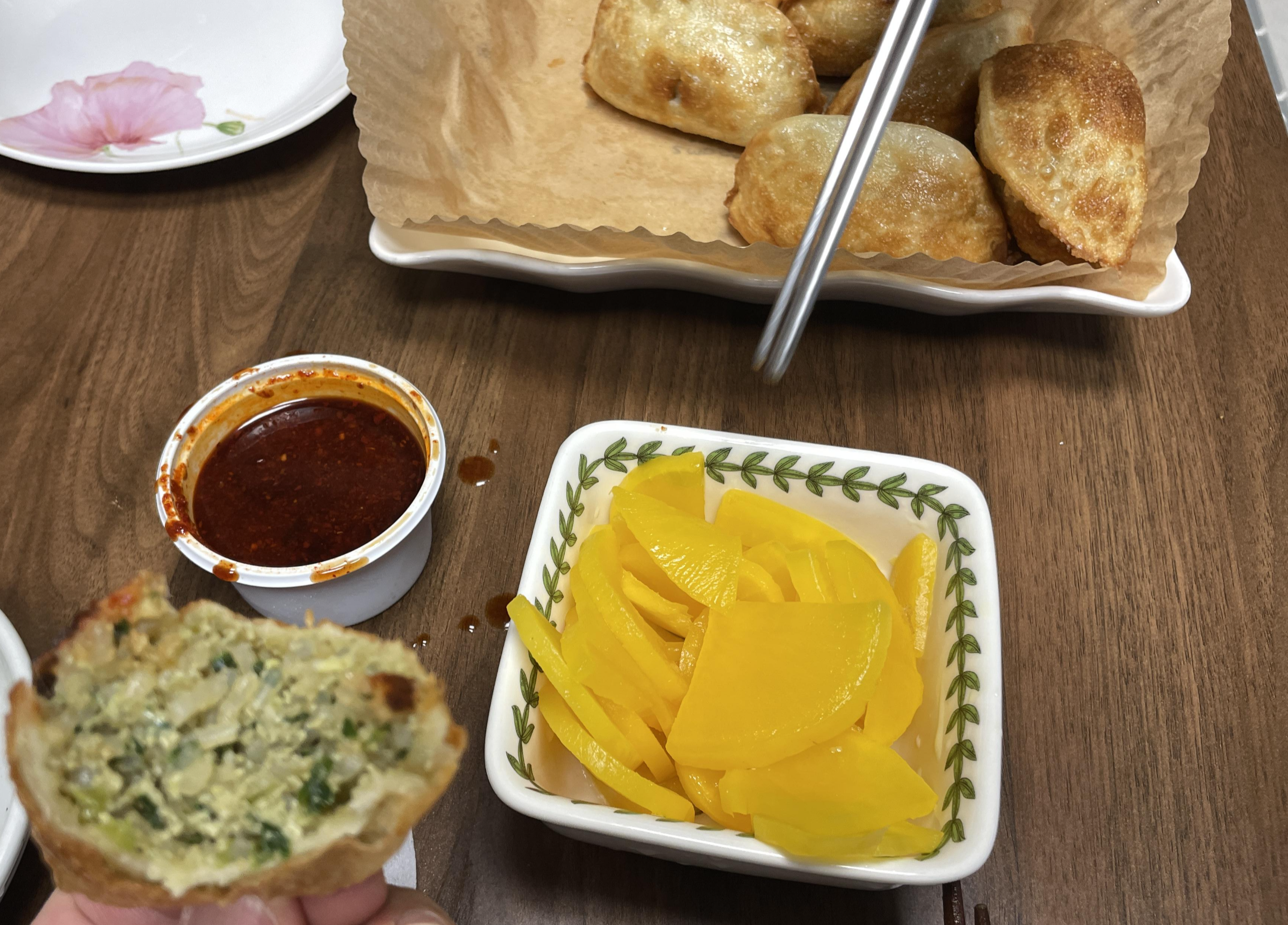 5) 동봉된 단무지, 양념장과 같이 곁들여 맛있게 먹는다. 왼손으로 만두 꼭지를 잡고 오른손으로 단무지를 양념장에 찍어 만두 위에 올려 먹는 것이 핵심이다.