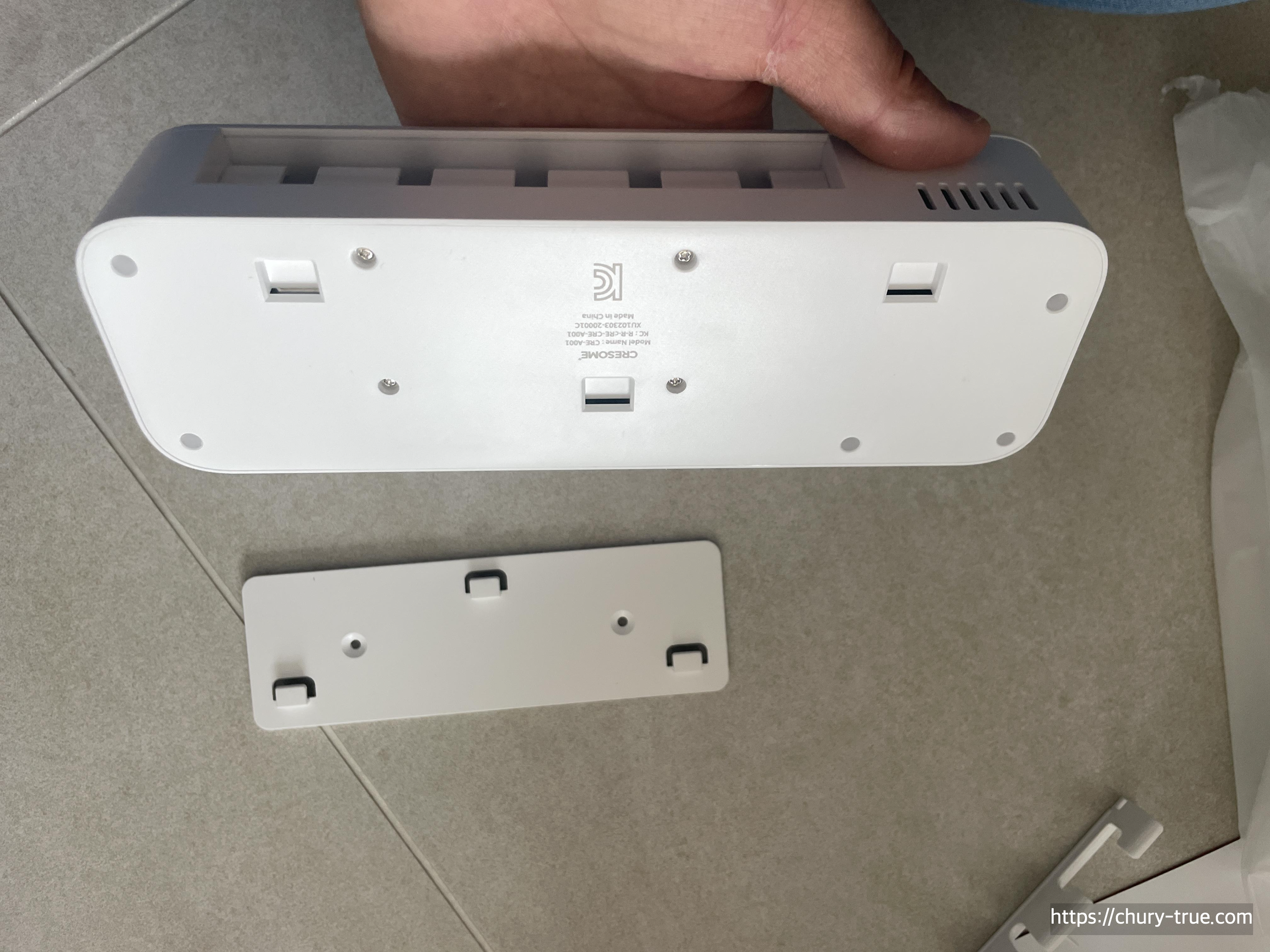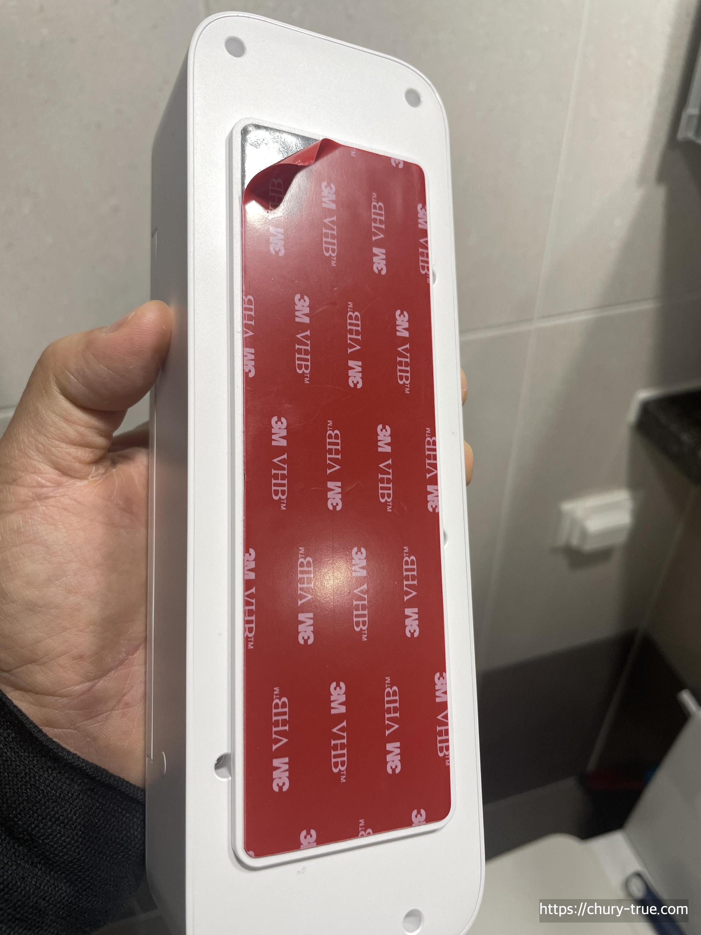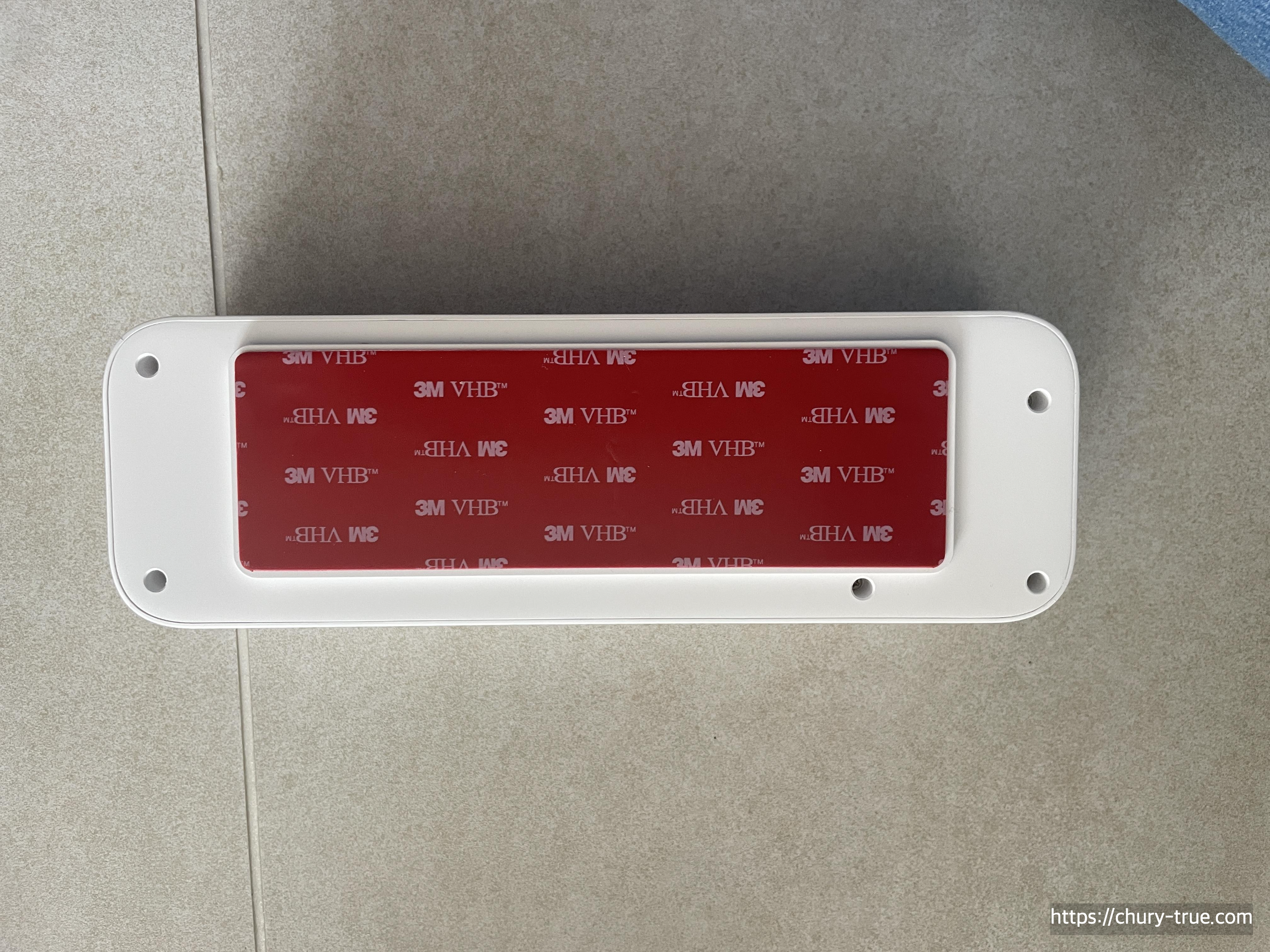 본체 뒤편에 보면 본체를 거치하는 거치대가 있다. 이를 분리하여 양면테이프를 제거하고 설치하고자 하는 위치에 고정한다.