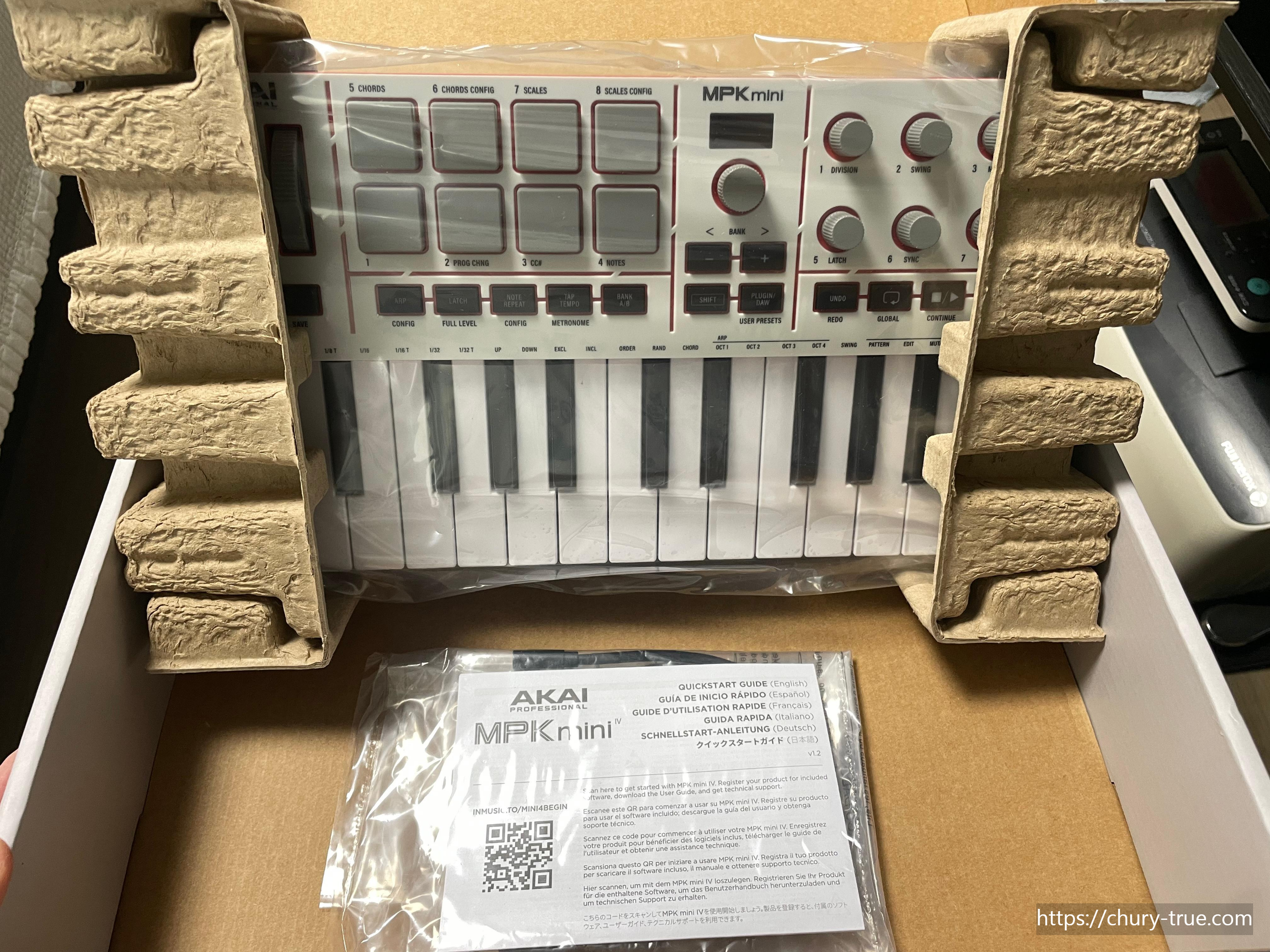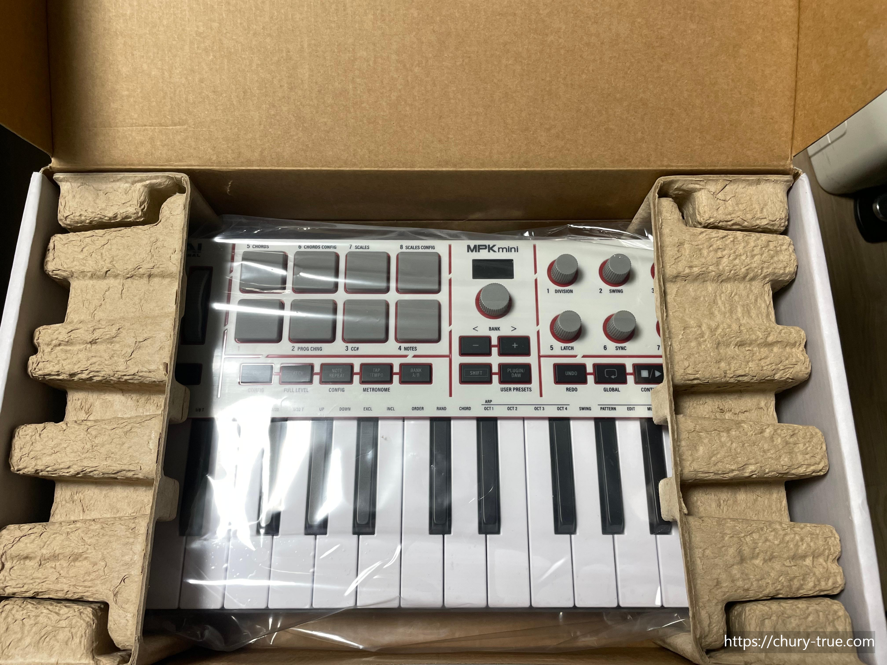 아카이 MPK mini4는 박스에 동봉되어 있으며 반드시 박스에 테이프로 밀봉이 되어 있는지 확인절차가 필요하다. 새제품은 박스에 테이프로 고정되어 있다. 참고로 필자는 쿠팡에서 배송 온 제품이 박스개봉 상품이 와서 하루 만에 교환 신청하여 새로 받았다.
