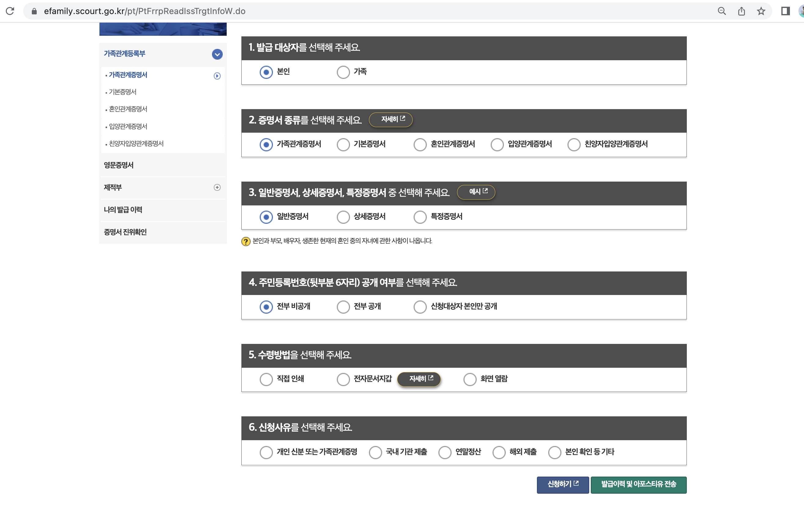3. 가족관계증명서 수령방법 및 신청사유 선택