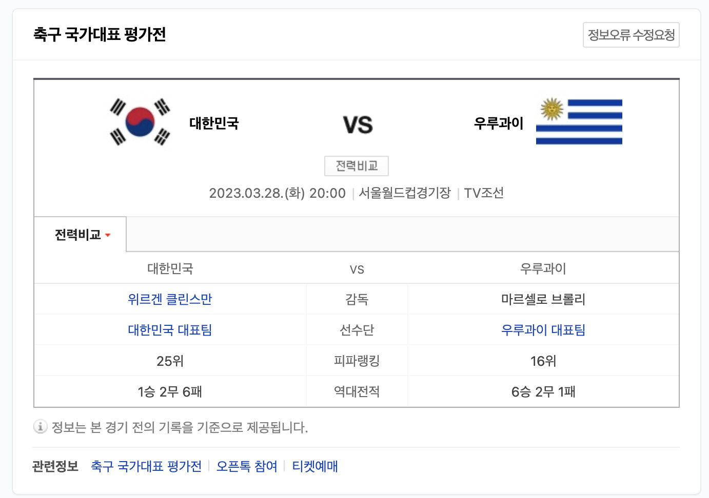 오늘 3.28일(화) 저녁 8시에 한국과 우루과이 축구대표팀 평가전이 있습니다.