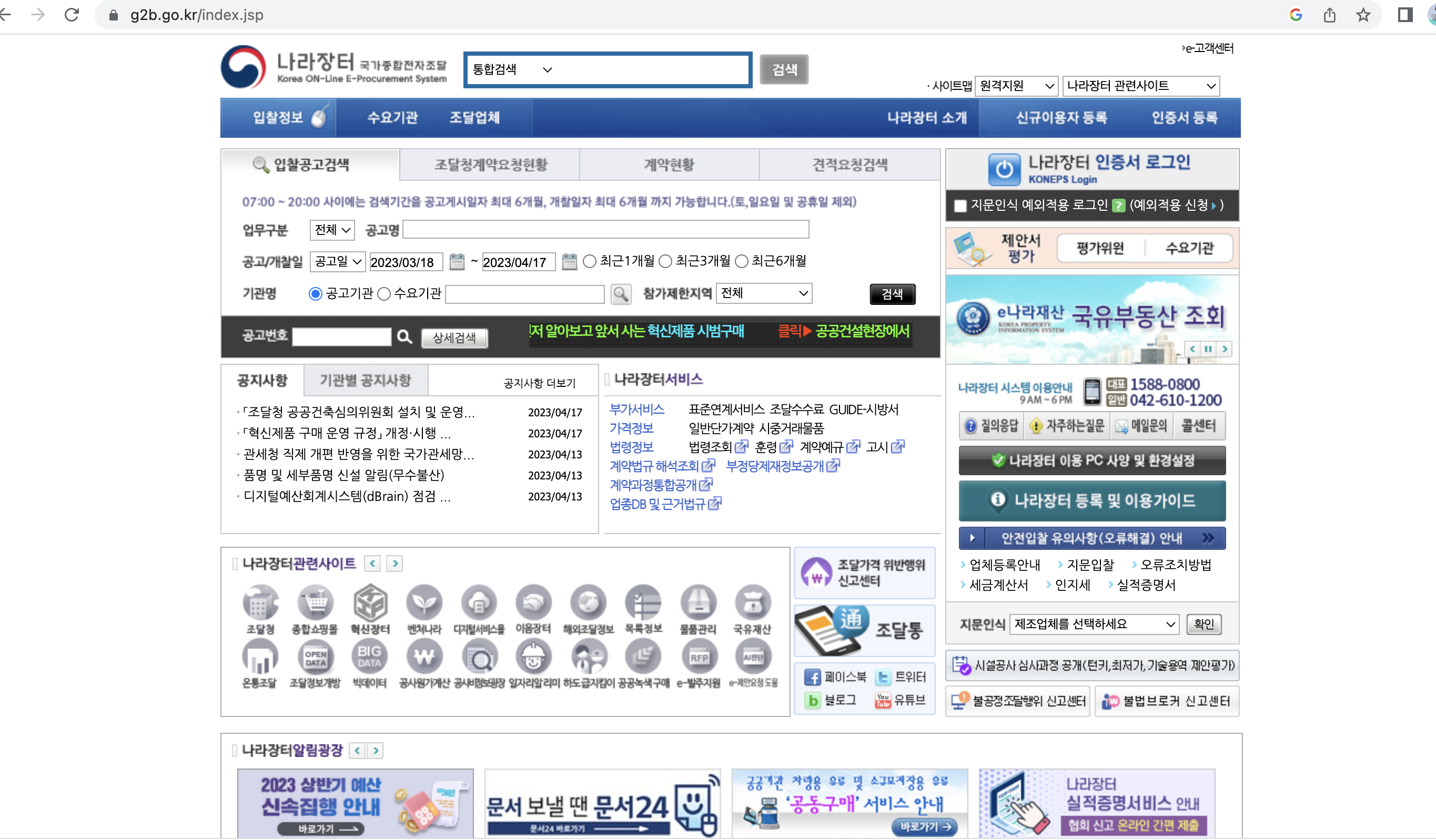 국가에서 종합 전자조달하는 사이트이다. 입찰공고 검색을 할 수 있다.